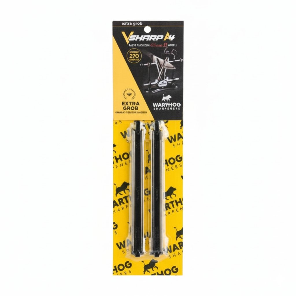 Máte brousek Warthog V-Sharp a potřebujete rychle obnovit velmi tupé nebo poškozené nože? Brusné tyče 270 grit jsou nejhrubší dostupnou zrnitostí – určenou pro náročné situace, kde je třeba rychle odstranit větší množství materiálu a opravit ostří.