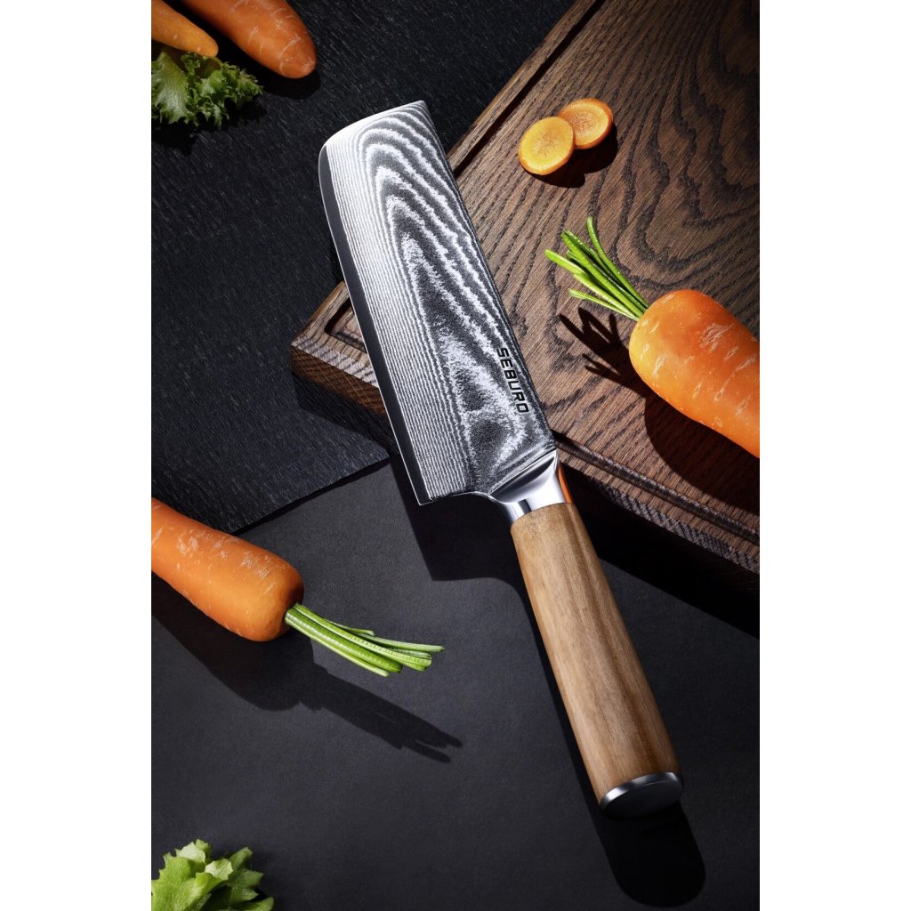 Nůž Nakiri je další jedinečný zástupce z řady Seburo HOKORI Damascus, kterou vřele doporučujeme všem zapáleným domácím kuchařům. Jde o klasický nůž japonského typu z damaškové oceli (damascus steel). Nakiri je tradiční japonský nůž především na krájení a sekání zeleniny, ovoce a bylinek, velice oblíbený mezi kuchaři. S nožem Nakiri velice snadno nakrájíte suroviny na drobné kostičky nebo tenké nudličky. Přes své rozměry čepele je nůž velice lehký a vyvážený.
