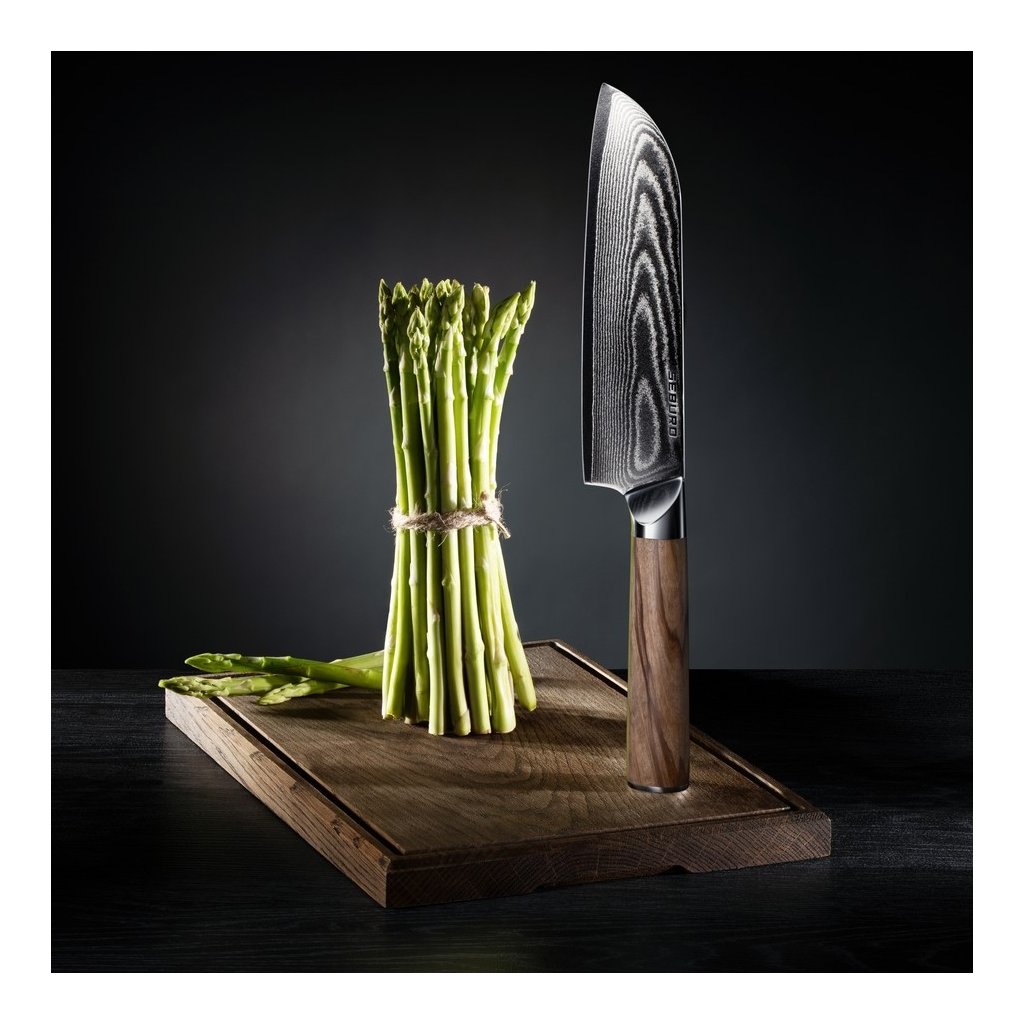 Nůž Santoku je další jedinečný zástupce z řady Seburo HOKORI Damascus Elite, kterou vřele doporučujeme všem zapáleným domácím kuchařům. Jde o klasický nůž japonského typu z damaškové oceli (damascus steel). Tento typ vznikl vlastně až v celkem nedávné době, když se v Japonsku rozšířila konzumace masa. Takže máte-li odvahu vyzkoušet jakýsi japonsko-evropský fusion, určitě si jej pořiďte, protože Santoku je v Japonsku analogický k evropskému noži typu „šéfkuchařský“.