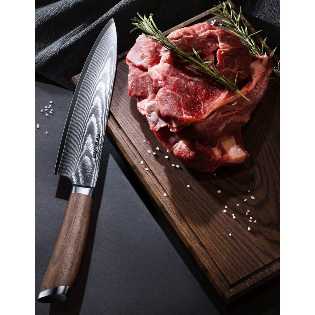 - Nůž šéfkuchaře Seburo HOGANI Deluxe Damascus 250mm z damaškové oceli nikdy nemyjte v myčce na nádobí.