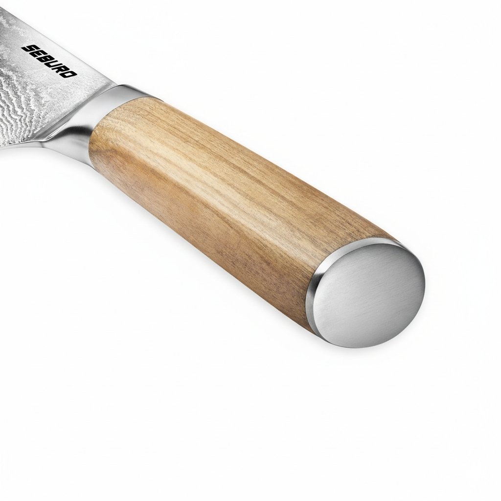 Elegantní rukojeť je příjemná do ruky a je vyrobená z olivového dřeva, což je ekologický a velmi odolný materiál s dlouhou životností. Navíc jde opět, podobně jako u damaškové oceli, o tisíce let starý materiál prověřený léty používání v kuchyních po celém světě. Vyžaduje sice občasnou údržbu, ale díky modernímu zpracování dřeva se jí není třeba obávat. Kovová podložka čepele osazená v rukojeti zabraňuje hromadění skvrn a nečistot na rukojeti, čímž se zvyšuje hygiena a snadnost údržby celého nože.