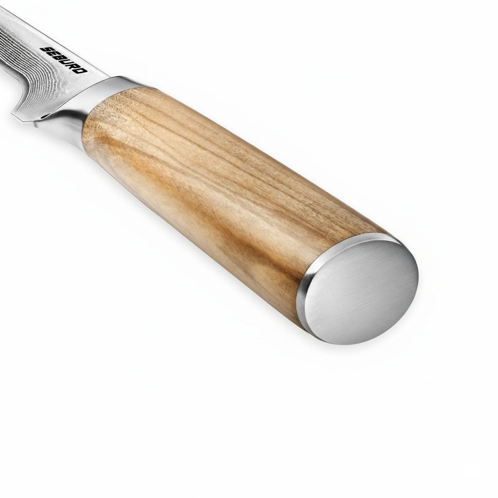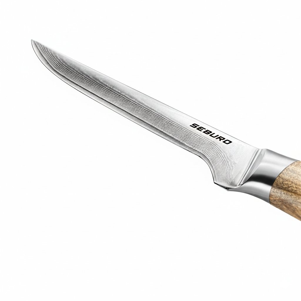 Vykosťovací nůž Seburo HOKORI má zúženou čepel, což se hodí zvláště při práci okolo kloubů a kostí. Je vyrobený z vysoce kvalitní damaškové oceli. Pohodlná rukojeť evropského typu je z přírodního olivového dřeva a snadno se drží.